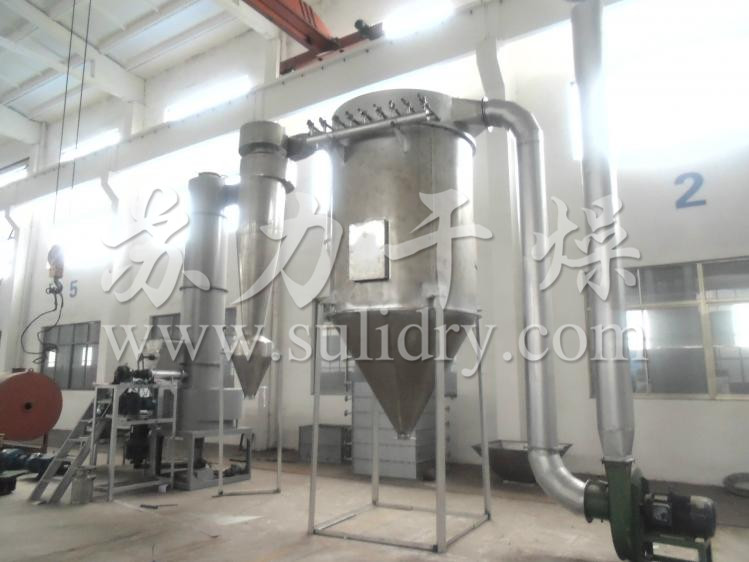 热空气切线进入干燥器底部,在搅拌器带动下形成强有力的旋转风场。膏状物料由螺旋加料器进入干燥器内,在高速旋转搅拌桨的强烈作用下,物料受撞击、磨擦及剪切力的作用下得到分散,块状物料迅速粉碎,与热空气充分接触、受热、干燥。脱水后的干物料随热气流上升,分级环将大颗粒截留,小颗粒从环中心排出干燥器外,由旋风分离器和除尘器回收,未干透或大块物料受离心力作用甩向器壁,重新落到底部被粉碎干燥。