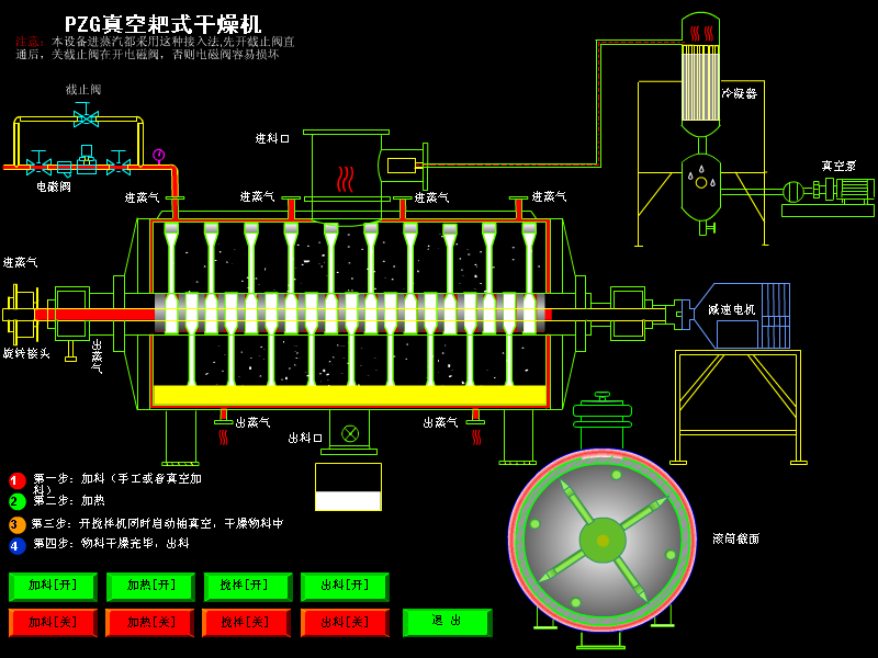 ZPG真空耙式干燥机是一种新颖卧式间歇式真空干燥设备,湿物料经传导蒸发,带有刮板搅拌器不断清除热面上的物料,并在容器内推移形成循环流,水份蒸发后由真空泵抽出。本机采用大面积夹层加热方式,传热面大,热效率高,设置搅拌,使物料在筒内形成连续循环状态,进一步提高了物料受热的均匀度,从而可顺利进行浆状、膏状、糊状物料干燥。