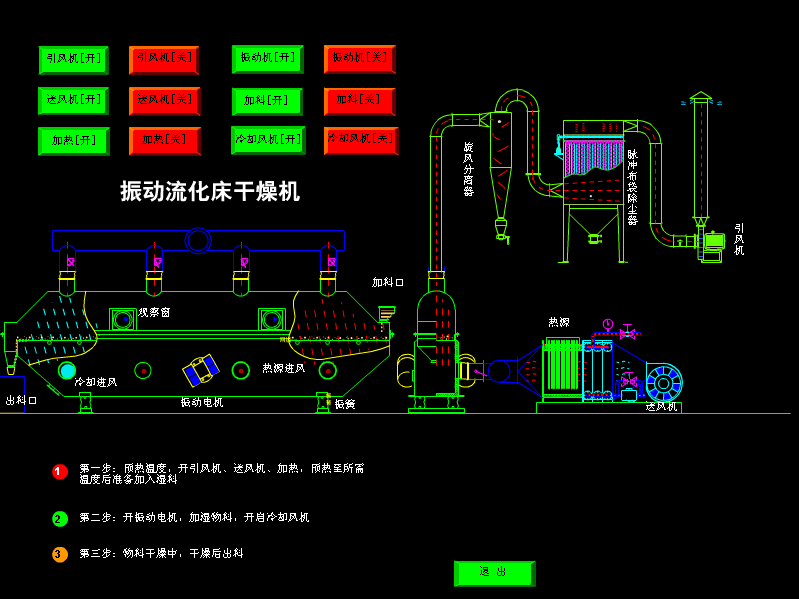 换句话说,也就是进入流化床内的湿物料与热空气在布风板上方接触,物料颗粒悬浮于气流之中,形成流化状态。振动流化床也就是利用呈流化状态的物料颗粒与热空气均匀、充分地混合,进行十分强烈的传热和传质,脱除水分,达到干燥目的。最终合格的产品由流化床的出料口排出,含尘气体经除尘装置净化后由引风机排入大气。